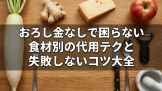 おろし金がないと、大根おろしやしょうが、にんにくを作るだけで急に面倒に感じますよね。でも実は「すりおろし」は、細かさと水分、香りの出し方を再現できれば、家にある道具で十分代用できます。この記事では、包丁とまな板で作る基本の「刻む→叩く」から...