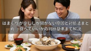はまぐりが少ししか開かないと、追加加熱するべきか、食べていいのかで一気に不安になりますよね。この記事では、半開きが起きる代表的な原因を整理しつつ、酒蒸し・汁物・焼きそれぞれで失敗しない加熱のコツをまとめます。さらに、においや汁の濁りなどの危...