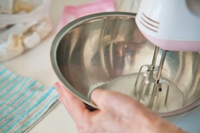 ハンドミキサーで混ぜるとき、スピードが速すぎたり、長時間混ぜすぎたりすると、空気がたくさん入って生地の温度が上がり、脂肪分と水分が分かれやすくなります。