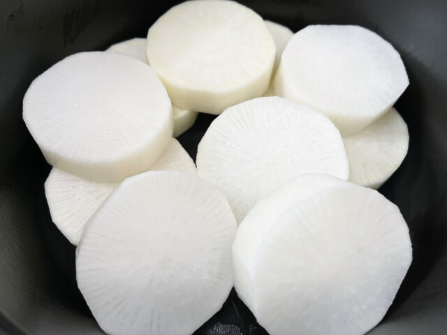- 煮汁を捨てて、大根を軽く水洗いする。