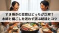- 半開きが端に偏るなら、鍋のサイズと並べ方を見直します。