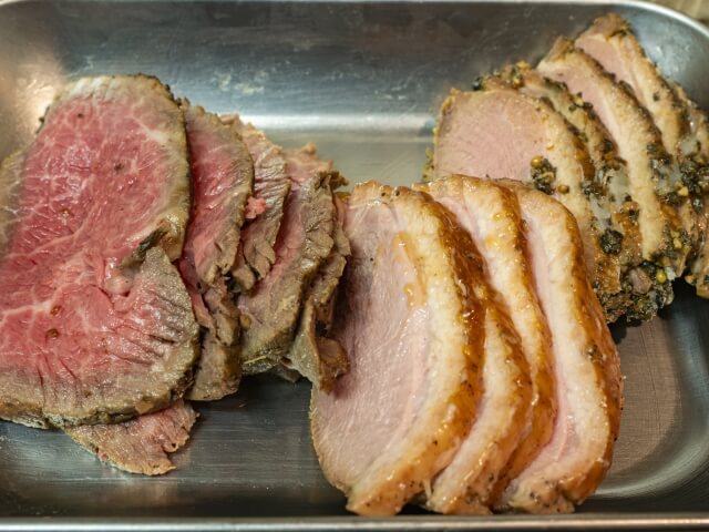 洋風 ローストビーフ、テリーヌ、スモークサーモン 彩りが華やかでワインにも合う